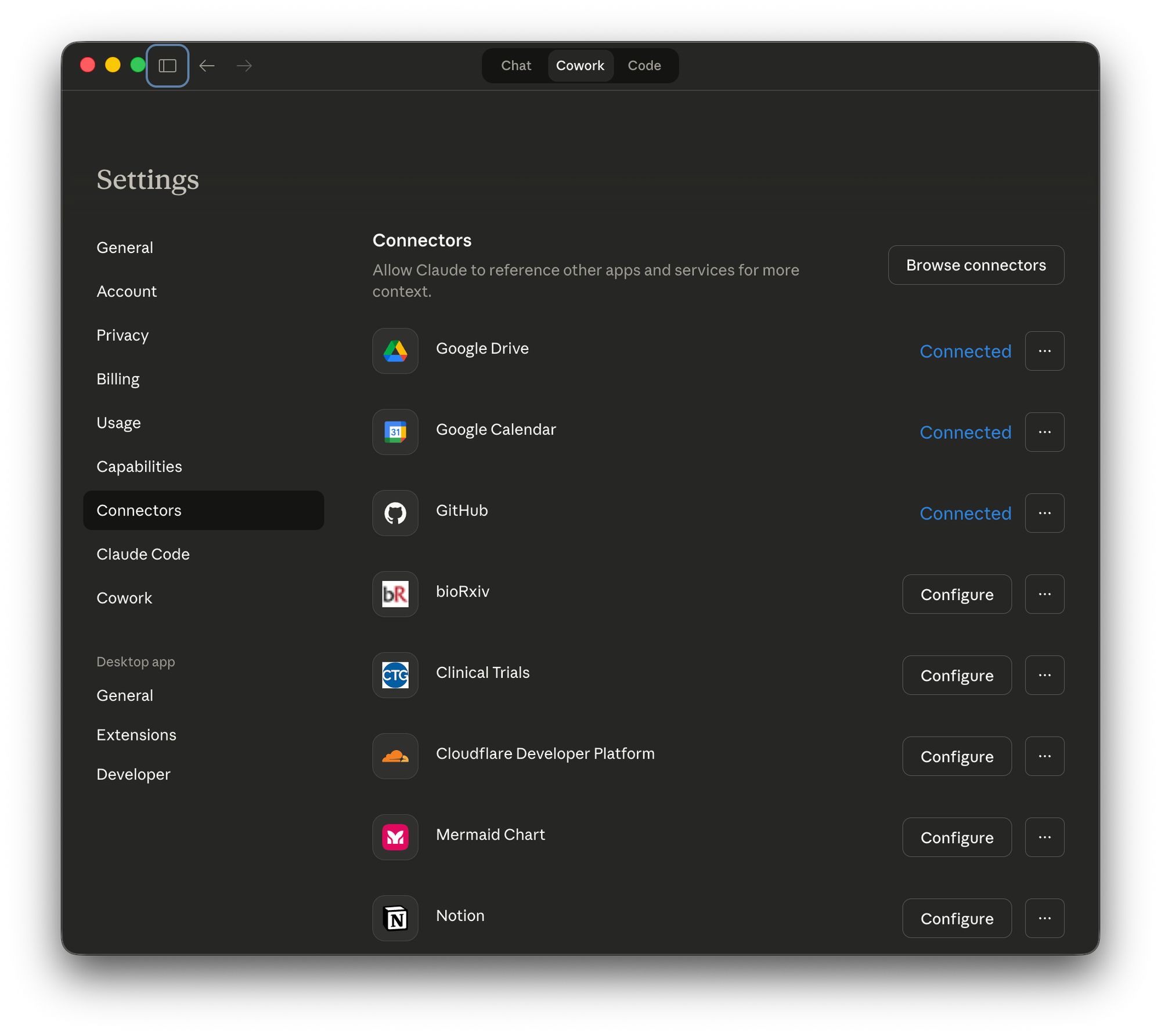 Unlike Coding agents, Cowork doesn't need you to know anything about code. It does require the same amount of clear instructions. And while coding tools will ask you for MCP servers, and API keys, Claude Cowork asks for "connectors" to be installed in the desktop app. Same thing, but polished.