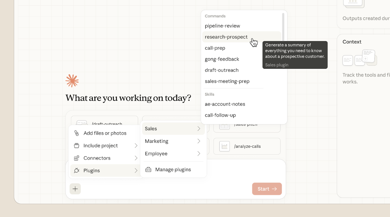 Plug it in. There are plugins that we can add to a Cowork project. I am not sure how they differ from skills, but they are recommended to help get better outputs.