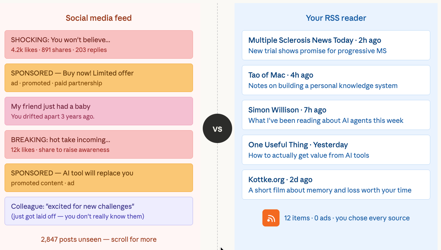 You're not missing out. That social media feed is a river of sludge and AI Slop where we compete for likes and shares that only help some CEO get another Ferrari. Finding something useful is a glitch in the algorithm that disconnected you from your friends and news sites that actually had something good. Now you're drained and you roll your eyes every time you open LinkedIn.